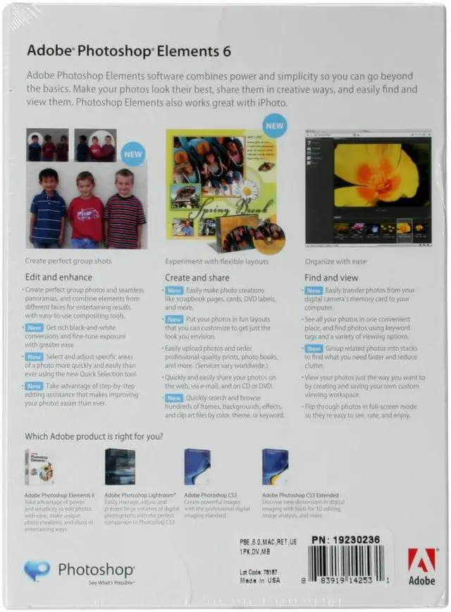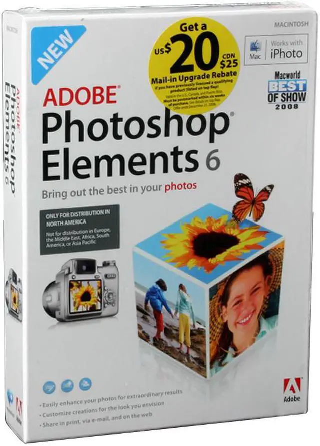 | Feature | Adobe Photoshop Elements 6 software combines power and simplicity so you can go beyond the basics. Make your photos look their best, share them in creative ways, and easily find and view them. Photoshop Elements also works great with iPhoto. |