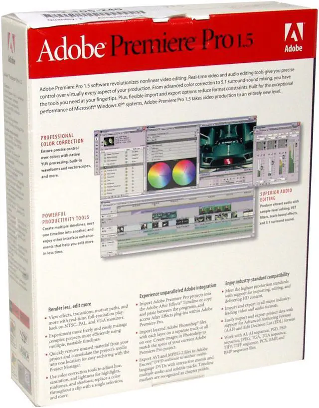| Feature | Adobe Premiere Pro 1.5 software revolutionizes nonlinear video editing. Powerful real-time video and audio editing tools give you precise control over virtually every aspect of your production. Built for the exceptional performance of Microsoft Windows XP systems, Adobe Premiere Pro 1.5 takes video production to an entirely new level. |