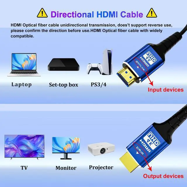 Important Note: Fiber Optic HDMI Cable is One Direction Transmission, The Source Plug Connects Video Devices such as Apple TV, Fire TV,PS4, PS3,4K Blu-ray Players, MEDIA PC, XBox One, XBox One S, Roku Ultra etc. The Display Plug Connects Display Devices such as TV,Displays, Projector, Moniter etc.