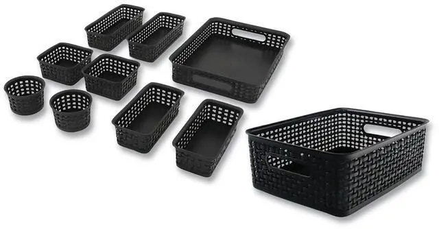 Package Includes: (2) Small Circular Baskets: 3.88" dia x 3.88"; (2) Small Square Baskets: 4.75" x 4.75" x 2.38"; (2) Medium Rectangular Baskets: 3.75" x 7.75" x 2.38"; (2) Large Rectangular Baskets: 3.88" x 9.63" x 2.38"; (1) Extra-Large Square Basket: 10.88" x 13.88" x 4.69"; (1) Shallow Basket-Storage Bin: 10.13" x 13.88" x 4.69"