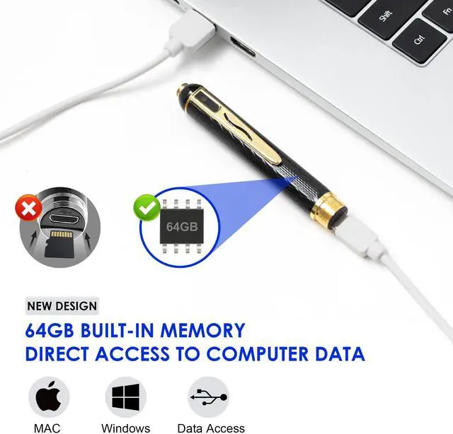 Complete Family-Use Kit No Audio Recording Includes: camera pen, USB-C charging cable, OTG adapter for Android, 64GB card, and 5 ink refills. No microphone or audio function, fully compliant with Amazons policy.