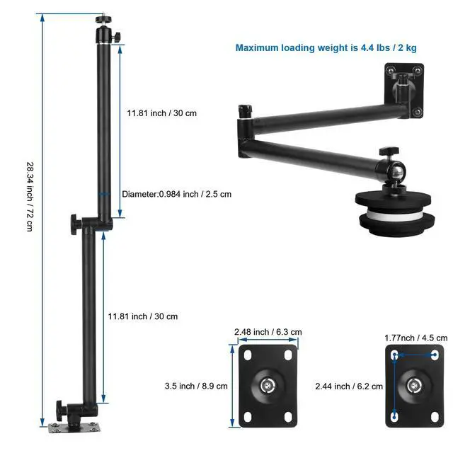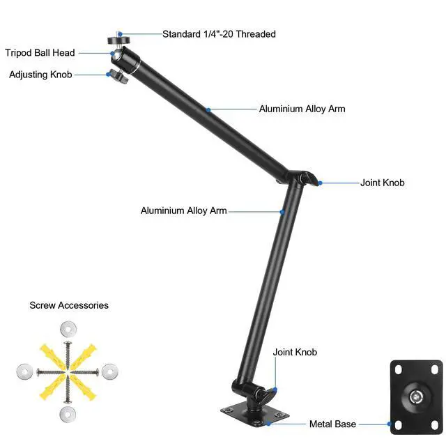 Aluminum alloy camera holder is designed for indoor usage, it's perfect for installation in photography studio or live streaming room,load maximum capacity is 4.4 lbs / 2 kg, with 1/4 "-20 threaded compatible with different style of DSLR cameras,two joint knobs are used to adjust the position of the arm, metal tripod ball head is used to adjust angle of camera,it can be installed on the wall, ceiling, wooden board, flat smooth metal surfaces etc.(Notes:don't recommend to install outside).