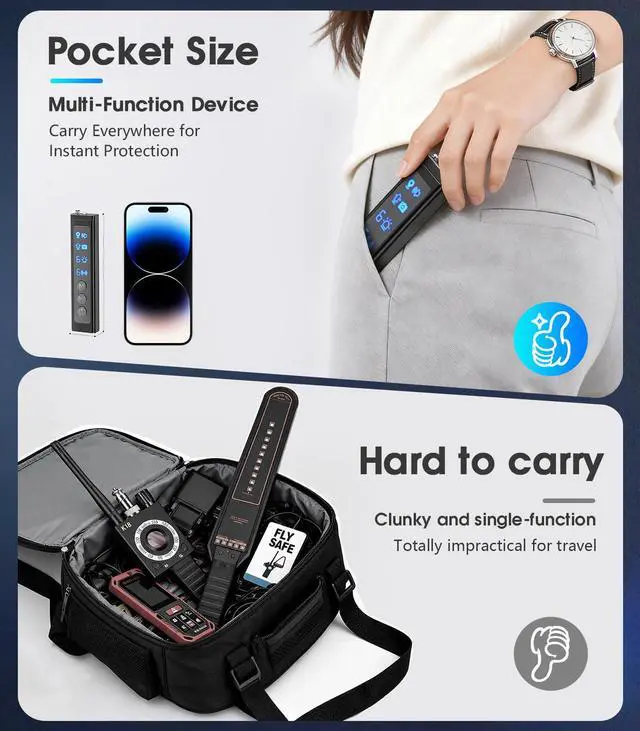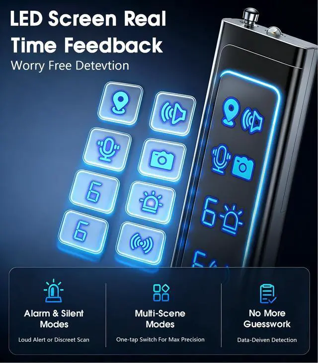 6 Sensitivity Levels & 2 Discreet Alert Modes: This Hidden Camera Detectors features 6 adjustable sensitivity levels, allowing you to customize the detection range based on different scenarios.It supports two alert types: visual LED indicators for clear status checks and silent mode for discreet operation,ideal for business meetings, travel stays, or daily use without drawing unnecessary attention.