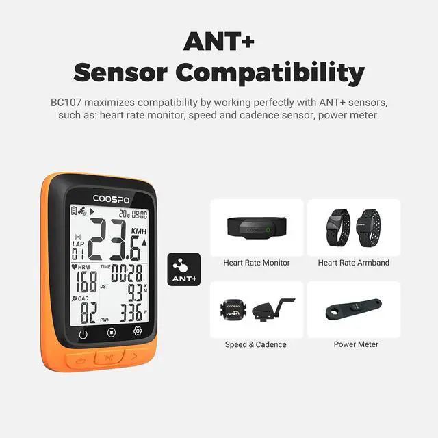 ANT+ SENSOR COMPATIBILITY: Built for both budget and convenience, BC107 maximizes compatibility by working perfectly with ANT+ sensors, such as heart rate monitor, speed and cadence sensor, and power meter. Note: BC107 only supports ANT+ connection and does not support Bluetooth connection for the time being. Bluetooth is used for pairing with the CoospoRide app.