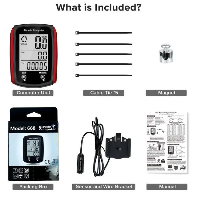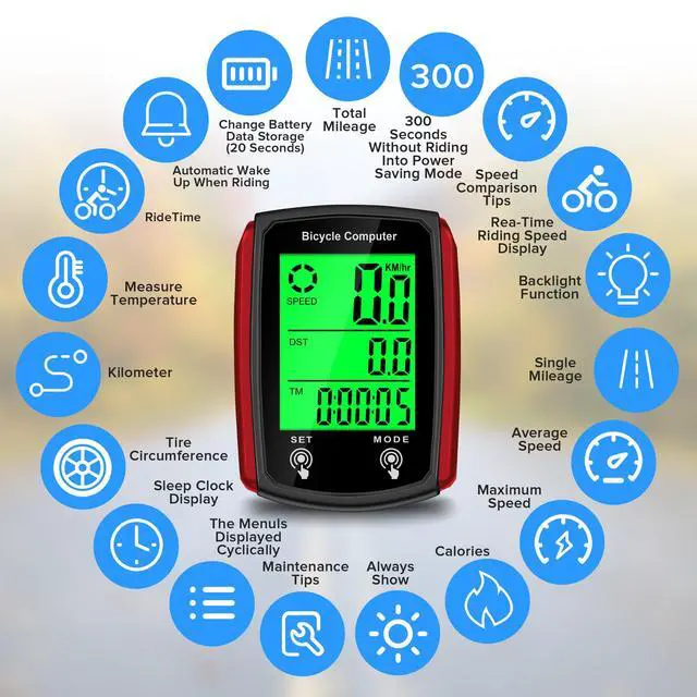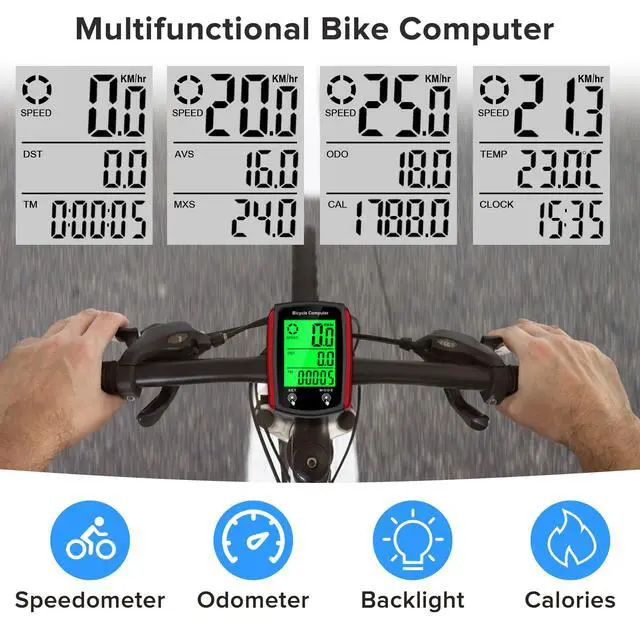 Multi-functionsCycle Computer measures your riding data like Speed Average, Maximum and KM hour, Riding time and distance. Added new function like record calories statistics, temperature, etc. Small and portable, waterproof design, Exactly what any serious bicyclist or fitness fanatic needs to know about this bike accessories
