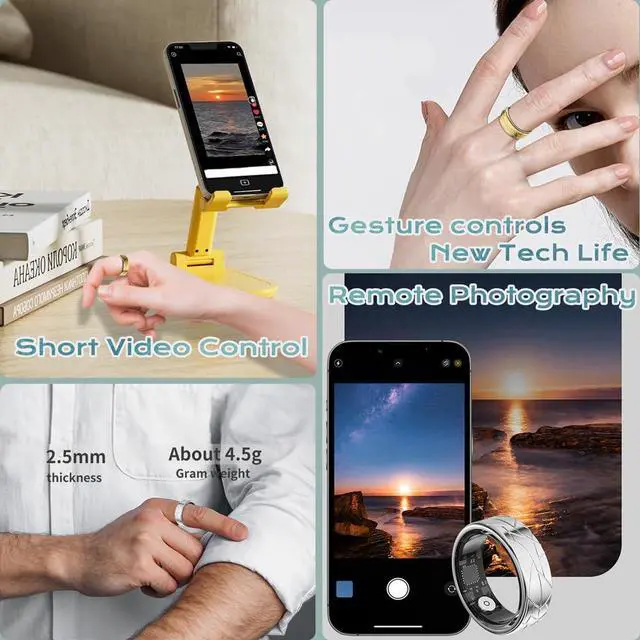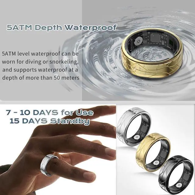 (1)Tracks sleep/workouts/steps/heart rate//otherhealth data better than watches. Gesture controls for photos/short videos. (2)Monitors deep/light/awake sleep. Lightweight design. App charts improve sleepquality. (3)Syncs heart rate/other health data/steps/sleep analysis on app homepage. Precise sensors for reliable results. (4)Logs routes, steps, calories, duration, speed & heart rate in activity mode. Multiple sports supported. (5)5ATM waterproof. 7-10 days use. 15 days standby.