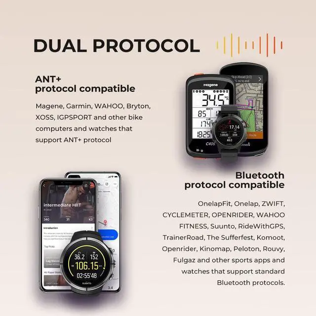 - ANT protocol compatible: Magene, Garmin, WAHOO, Bryton, XOSS, IGPSPORT, and other bike computers and watches that support ANT+ protocol