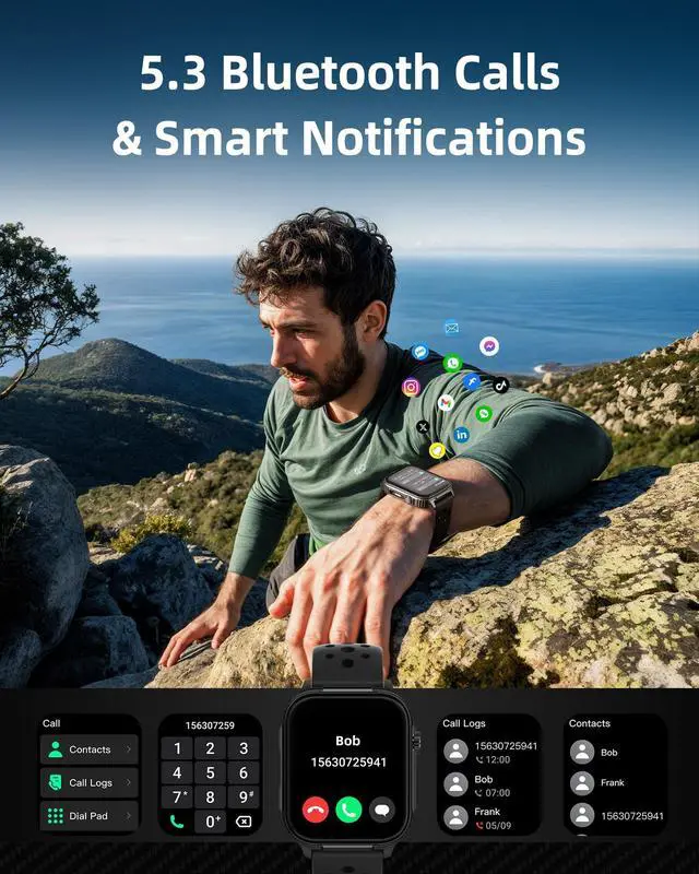 BLUETOOTH CALLS, SMART NOTIFICATIONS & SOS Stay connected and safe with this smartwatch, featuring Bluetooth 5.3, a high-quality stereo speaker, and a sensitive microphone. Make and receive calls directly from your wrist, perfect for driving, workouts, or when your hands are full. Get instant vibration alerts for SMS, WhatsApp, Facebook, and more. With SOS emergency call and voice assistant, help is always at hand. Note: messages cannot be replied to directly from the watch.