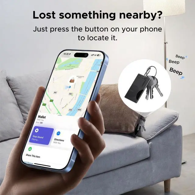 Loud 100dB Alert: When the map shows items nearby, you can tap "play sound" in the Apple Find My app. The wallet tracker emits a 100-decibel beep within Bluetooth range as loud as a morning alarm clock audible even under thick blankets, cushions, or in a hidden corner
