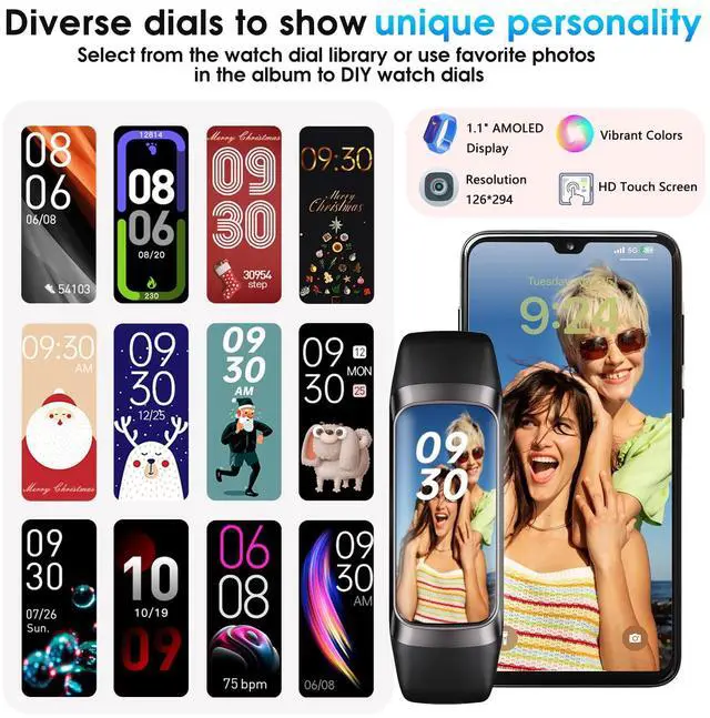 Fitness Tracker, 24/7 Heart Rate Blood Oxygen Blood Pressure Body Temp Monitor Sleep Calorie Tracker with 1.1" AMOLED Touch Color Screen Pedometer Smart Watch Waterproof for Women Men