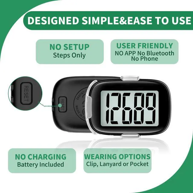 SIMPLE AND EASY TO USE: Our 3D black pedometer is designed just for counting steps. It is the simplest pedometer with only one button, no app, Bluetooth or phone required, to reset the pedometer number to zero, just press and hold the RESET button for 3 seconds