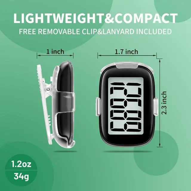 PORTABLE AND LIGHTWEIGHT: This black pedometer features a compact design that is easy to carry around. Comes with a detachable clip and lanyard, can be clipped to a pocket, belt or belt, hung around the neck, or placed in a pocket or bag