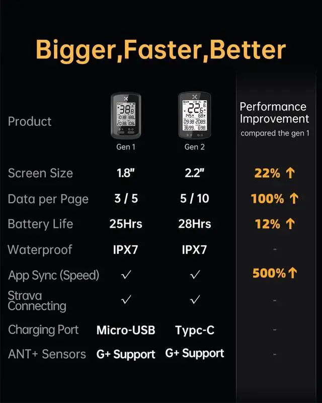 RICH SCREEN DATA DISPLAY?SUPPORT HEART RATE & CADENCE?28H BATTERY LIFE?2.2 INCH LARGE SCREEN