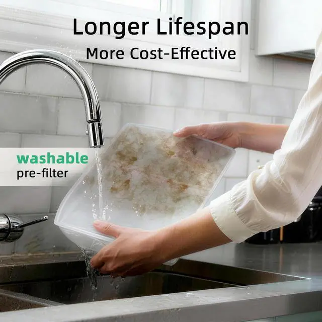 Cost-Effective Washable Pre-Filter: The removable, washable pre-filter traps large debris like pet hair and lint, extending the life of the main filter and lowering long-term costs. (Recommended replacement every 36 months; Filter Model: B0FM2MY6YS).