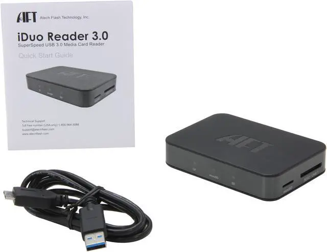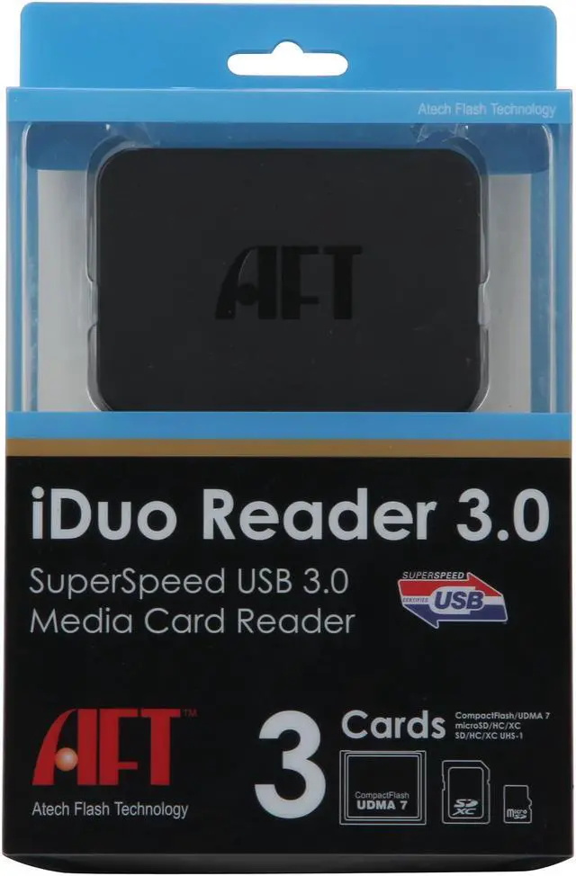 It's time for your card reader to evolve. The AFT iDuo Reader 3.0 Card Reader comes with the latest USB 3.0 connectivity to make the most of your high speed flash storage. Its 3-in-1 design includes one microSD, one SDXC/UHS1, and one CF/UDMA slots for compatibility with multiple media formats. Custom Icons for each media slot enables quick access. And its modern styling makes this reader a great match to today's stylish new desktop and laptop computers.