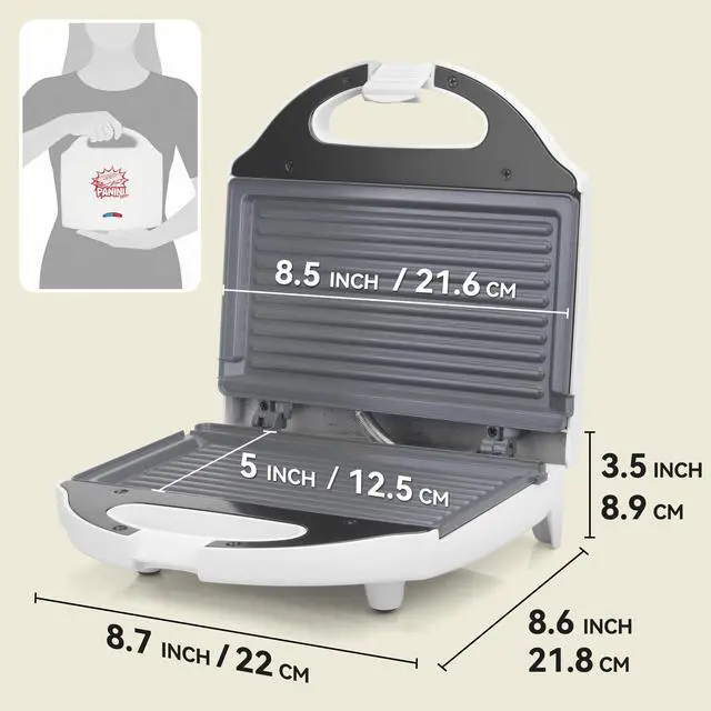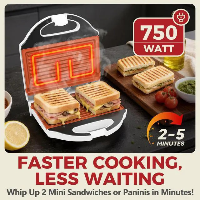 Ceramic Mini Panini Press Grill Sandwich Maker, Mini Sandwich Press, Panini Maker, Sandwichera Electrica, Panini Grill, Toaster Press, Grill Burgers or 2 Slices Sandwiche at a Time, White