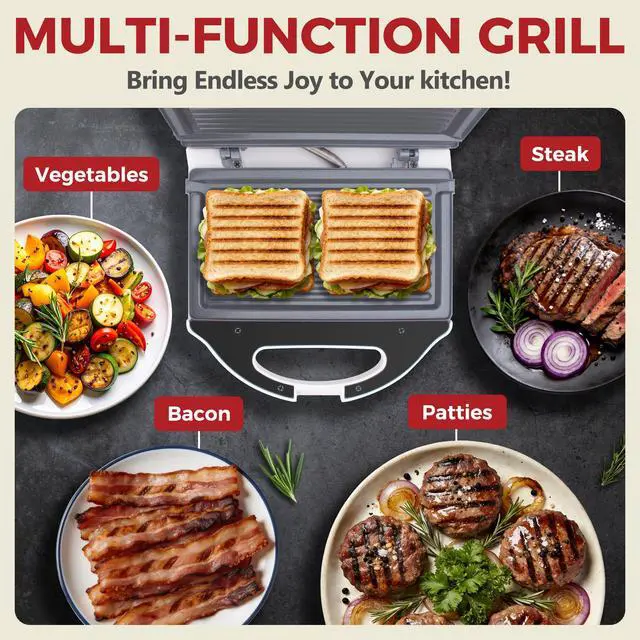 [Versatile Usage]: With fast heating, this panini grill press sandwich maker can grill 2 sandwiches at a time, and also effortlessly cook burgers, steaks, veggies and more in a breezeperfect for brunch or a quick, healthy on-the-go meal!