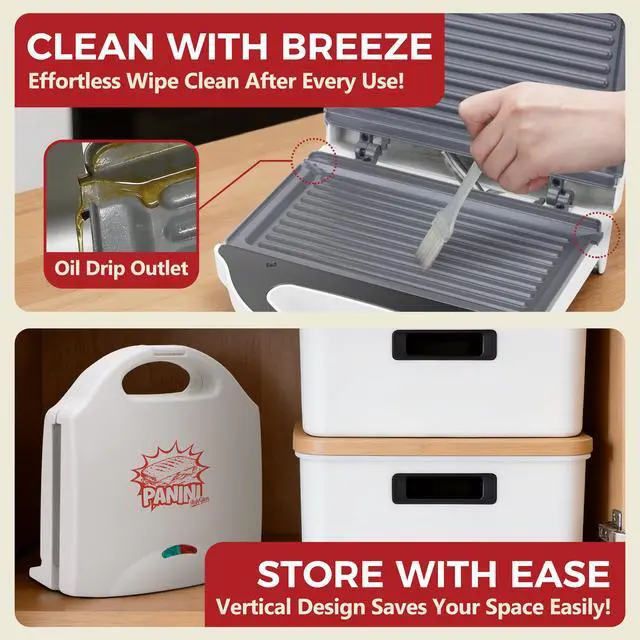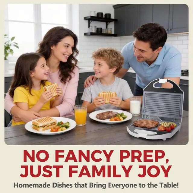 [Hassle-Free Experience]: The sandwich press grill features a premium non-stick coating that ensures easy food release and ultra-simple cleaningjust a quick wipe, and it's spotless with zero fuss.