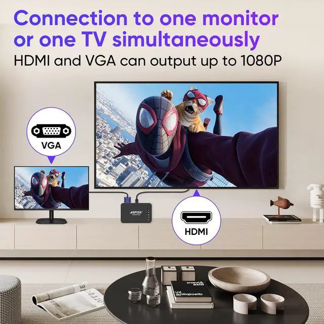 - Moreover, it supports HDMI/AV/VGA output, Supports simultaneous output of two displays (with a maximum resolution of 1080P)