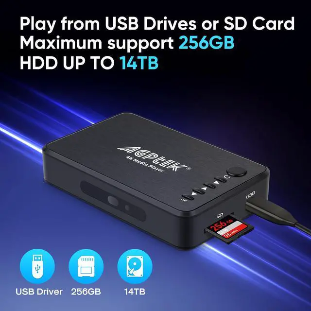 - USB flash drive /sd card up to 256GB and external HDD up to 14TB