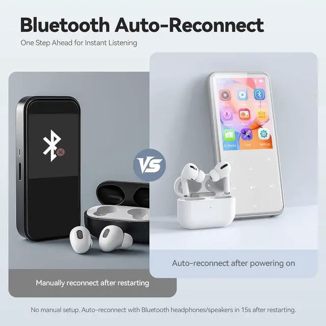 • Bluetooth 5.3 & Automatic ReconnectionAGPTEK M3 MP3 music player adopts Bluetooth 5.3 technology, more stable connection, better compatibility, and lower consumption. You can pair the Bluetooth MP3 Player with wireless headphones or a Bluetooth speaker, automatically connects to the last Bluetooth device it was connected to, as soon as it is activated.