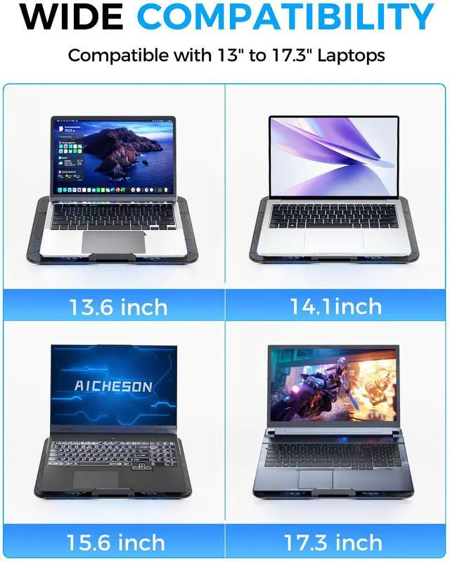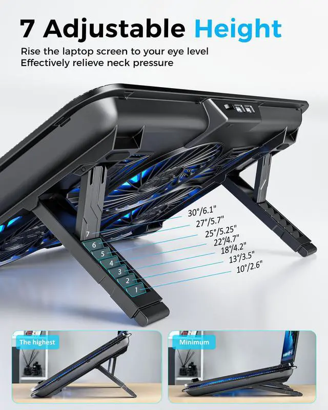 This laptop cooler cooling pad is also designed with ergonomics in mind. Its adjustable angles, ranging from 10° to 30°, and customizable height settings ( 2.6" - 6.1" ) allow you to set up your laptop at the most comfortable viewing and typing angles, reducing neck and wrist strain during extended use. Whether youre gaming, working, or watching videos, this laptop cooling stand adapts to your needs.