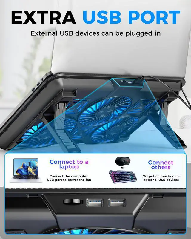 With noise levels as low as 17dBA, the laptop cooling fans are virtually silent at lower speeds, making it ideal for quiet environments. Even at higher speeds, the noise level peaks at only 35dBA, so you can focus on your game or work without distraction. The cooling pad for computer laptop also features two USB 2.0 ports, giving you the option to power the cooler while still having access to external devices like mice, keyboards, or external storage.