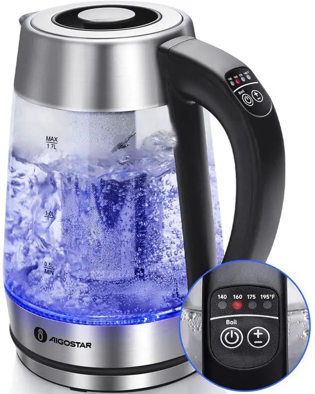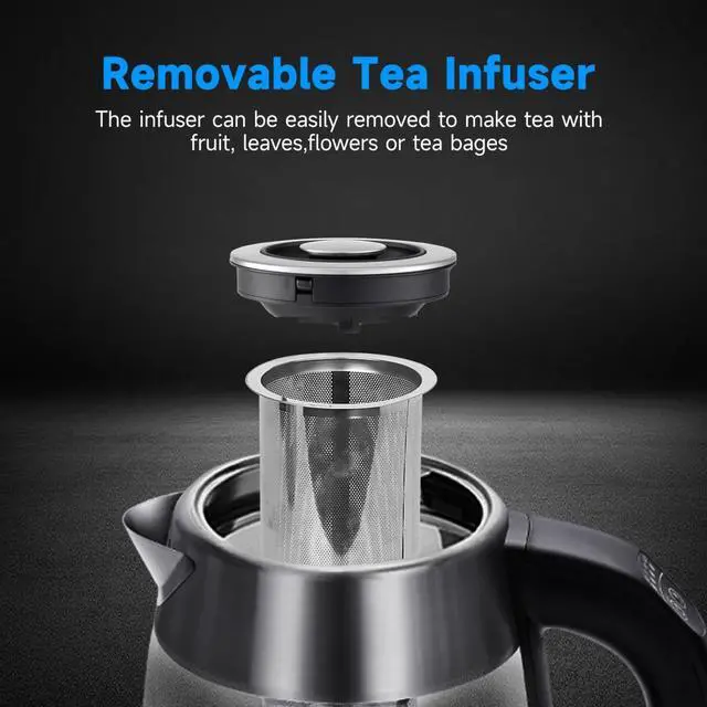 Electric water heater kettle has 5 preset temperature settings that correspond to an LED colored light: green, blue, yellow, purple and red. With the tea infuser included, you can brew your favorite loose-leaf or bagged teas directly in the stain-resistant borosilicate glass kettle.