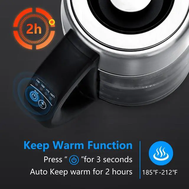 The variable temperature kettle also has a keep warm function that holds your water temp for up to 120min. The glass tea kettle will automatically shut off when the water reaches the set temp. When the water is nearly dry-out, the teapot will protect against overheating and switch off automatically.