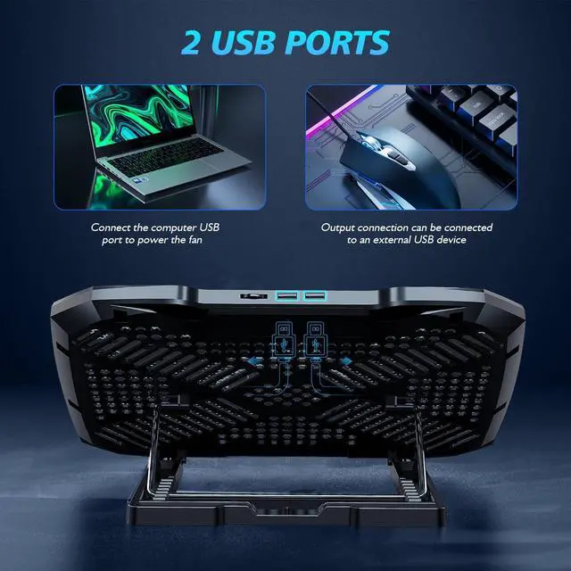 The computer cooling pads for laptops are equipped with 5 turbo fans (one small central fan and two larger side fans on each side) combined with a metal mesh design, delivering strong airflow to effectively cool your laptop.