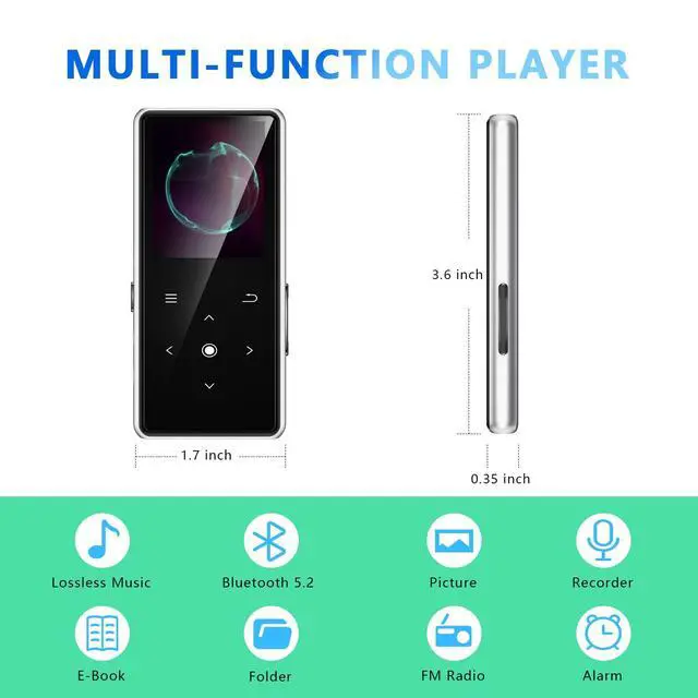 • Multifunctional MP3 Player for Many Occasions Multiple functions in one, music play, FM radio (need to insert a wired headphones), voice recorder, e-book, Alarm clock. Touch buttons with backlight to solve the problem of button noise. Perfect for Sport, Sleeping, Reading, Leaning, Meeting etc.