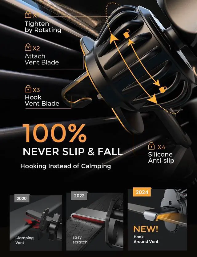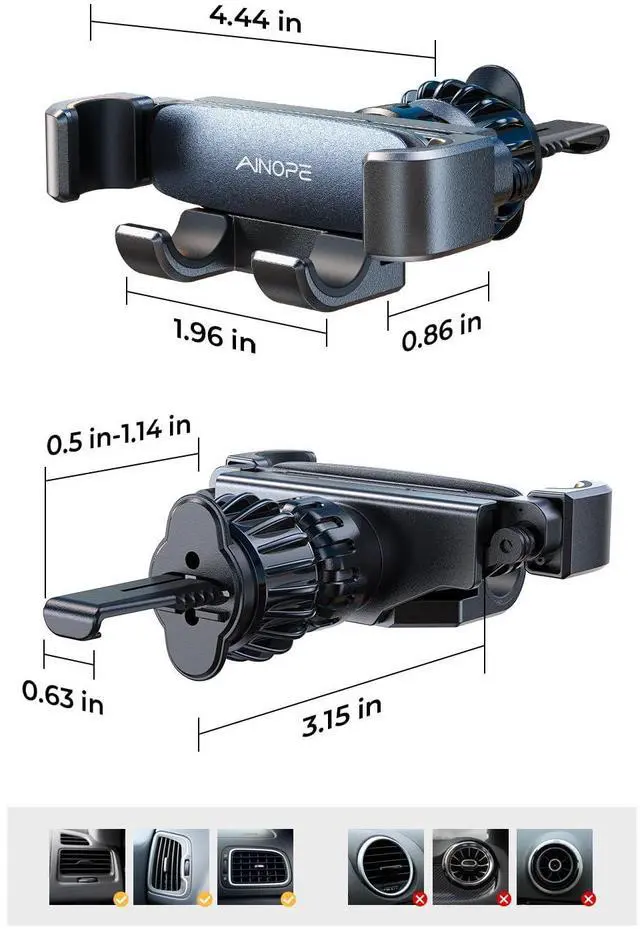 This car vent phone holder mount is designed as "Hook shape" and form "Three grasp points" which can firmly hook around the a/c vent for no slippage or movement. It solving the market's common problem of falling forward and off the air vent constantly when going over bumps or turns.