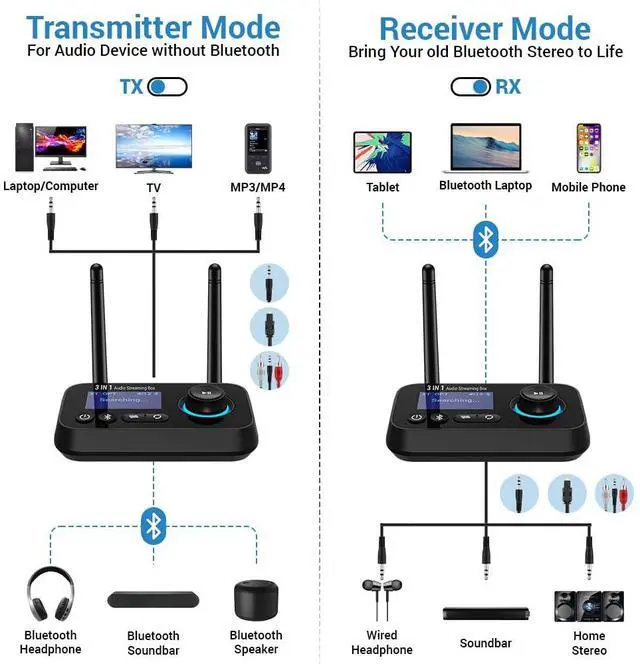 - Bluetooth Transmitter Mode: Via bluetooth connect, connecting bluetooth device headphones or earbuds and enjoy audio from your non-bluetooth tv/pc.