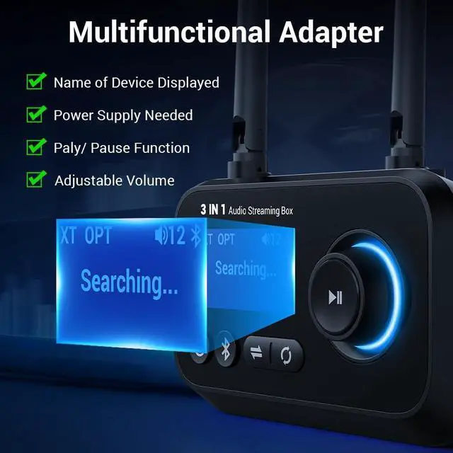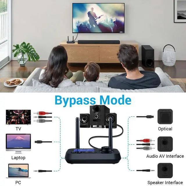 Dual antenna, LCD screen, multi-functional knob, low latency, aux/rca/optical port, you will have a great wireless experience with this bluetooth transmitter receiver.