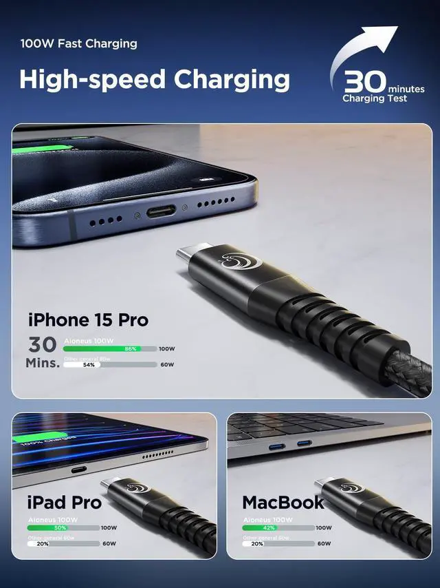 100W/5A Fast Charging: With PD and QC fast charging technology, your iPhone 15 Pro Max reaches a whopping 86% battery in 30 minutes, fast charging MacBook Pro 16" up to 42%, also charge iPad Pro to 50% while 60W cable is only 20%