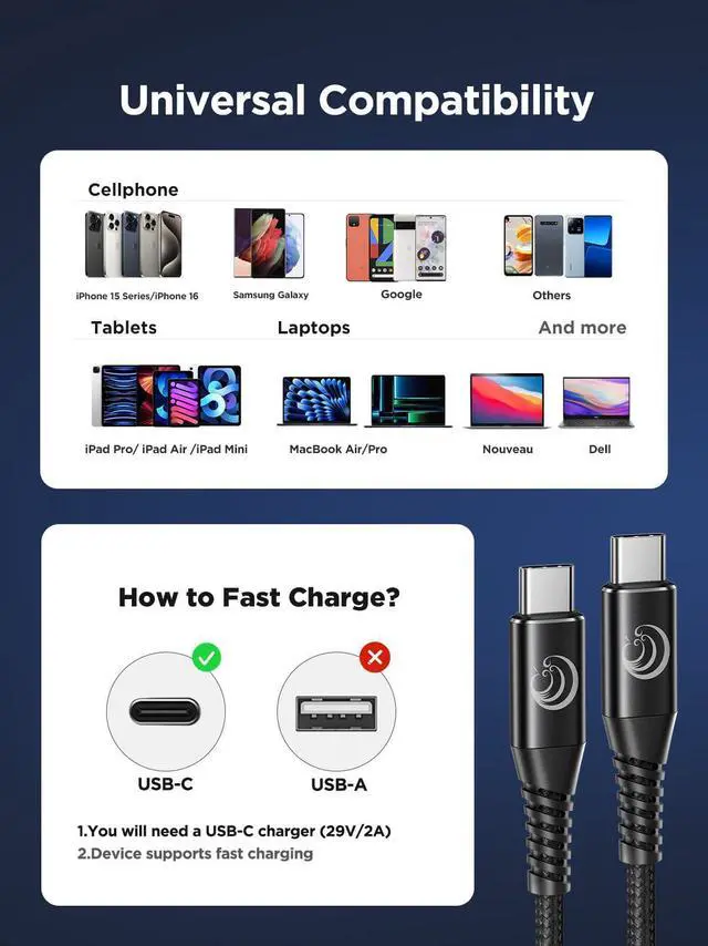 Compatibility: Aioneus USB-C to USB-C fast charging cable is fully compatible with Samsung Galaxy S25/S24/S23/S22/S21/S20/NOTE 20/10,A14/A15/A16/A20/A35/A53, Z Fold/Z Flip series, iPhone 16/16pro/16 plus/16 Pro Max/16e,15/15 Pro/15 Plus/15 Pro Max, MacBook Air/Pro 13"-16", iPad Pro 12.9''/11", iPad Mini 6, iPad 10, Google Pixel 8 Pro/8/7 Pro/7, PS5, Chromebook, Dell XPS, HP and other Type-C devices