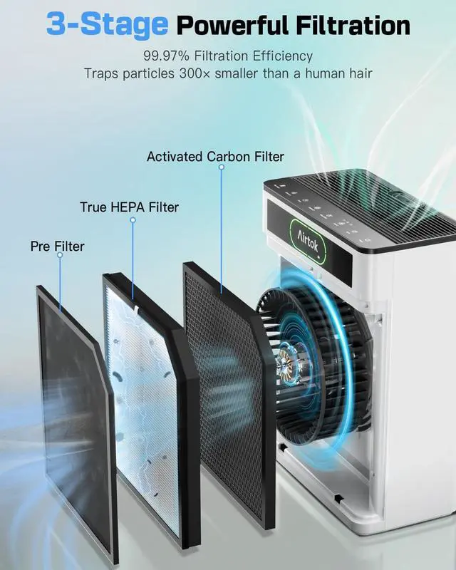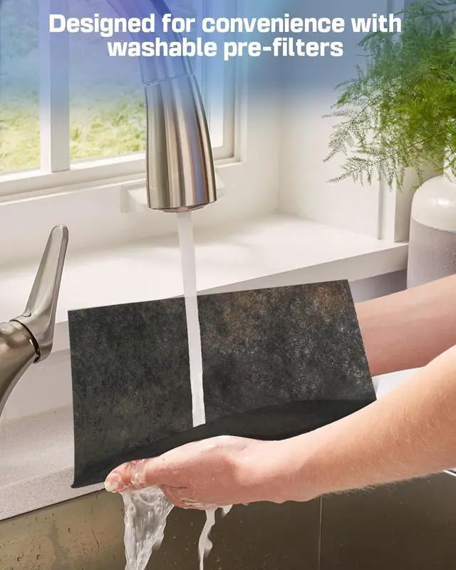 The washable pre-filter captures larger particles to extend the whole filter’s life. Depending on air quality, filters typically last 3–6 months.