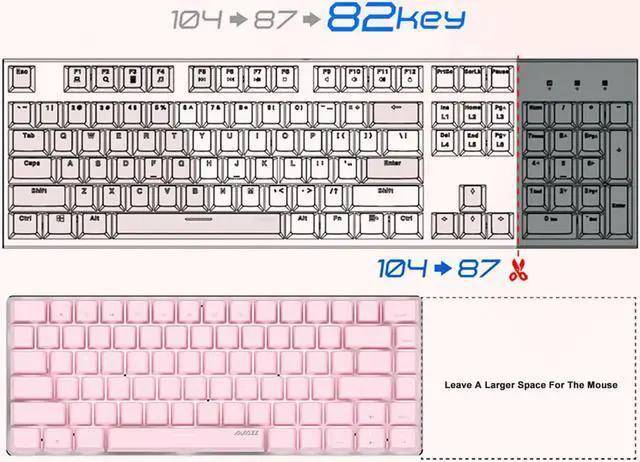 The size of the product is 14.9in * 5.1in * 1.7in, and the simple 82 key design improves and 60% keyboards are perfect, with game keys reserved. At the same time, it enlarges the space of the mouse infinitely, making playing games more comfortable.