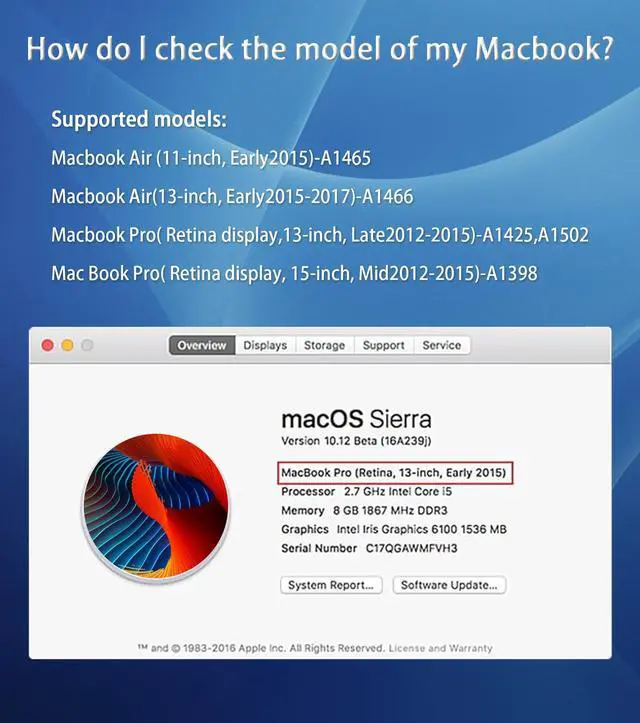 Click the "Apple" logo in the upper left corner of the Mac laptop desktop--"About this Mac"--check the release year and model.