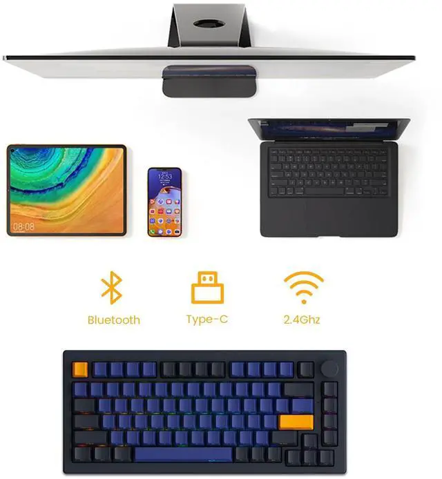 The Akko 5075B plus mechanical keyboard can be connected to multiple devices through bluetooth 5.0, multi-host 2.4Ghz (with a receiver), and wired Type-C modes with easy switch with a 3000 Mah large battery.