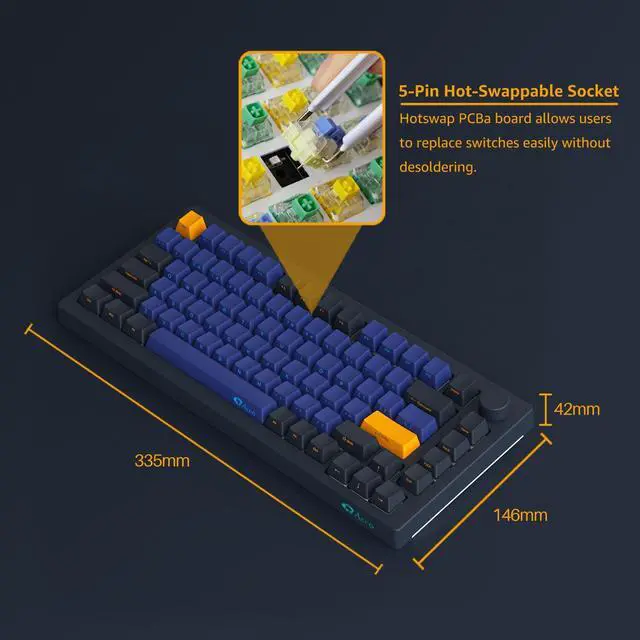 | Hot-Swappable | Compatible with most 3/5pins switches, such as Cherry, Gateron, Kailh, Akko, etc |