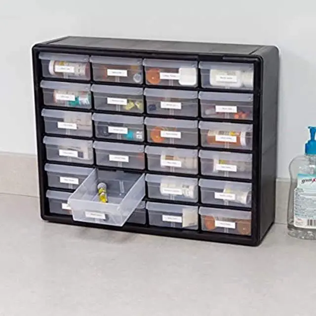 If you're looking for a way to store your hardware, the AKRO-MILS 10124 Drawer Bin Cabinet is the perfect solution. With 24 separate compartments, it will keep all of your parts organized and easily accessible. This cabinet has a total of 24 separate compartments that measure 4 1/2 in. wide by 6 3/8 in. deep by 2 in. high each. The drawers have been designed with black plastic handles, making them easy to open and close as needed. This drawer bin cabinet has an overall height of 15 13/16" and overall width of 20".