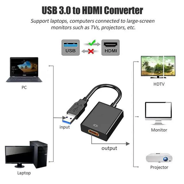 This converter can connect a PC or laptop with a USB 3.0 / 2.0 port to an HDTV with the HDMI port. You can stream audio, video, and images to larger screens for a better visual experience. Backward compatible with USB 2.0. But it is strongly recommended to connect with a USB 3.0 port for optimal resolution and performance.