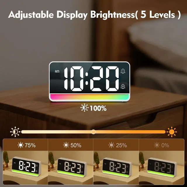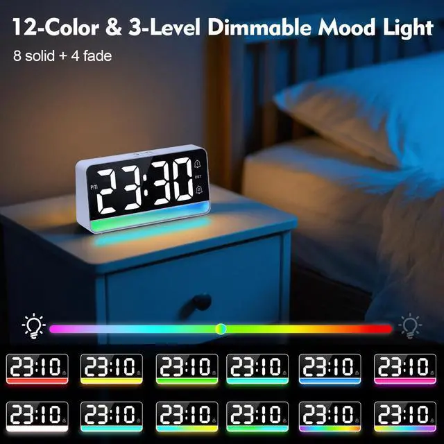 Multi-Color Mood Light : Choose from multiple soothing colors—this isn’t just a clock, it’s a gentle companion. Adjust its brightness across three levels (high, low, or off) to softly light up your night or stay fully dark for uninterrupted sleep.