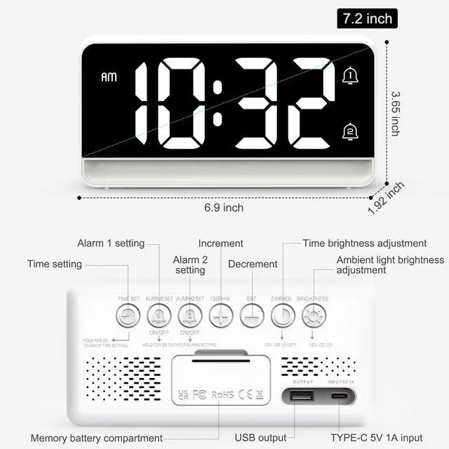 Always-Plugged-In & Extra Charging convenience: Powered by outlet for a consistently bright, sharp LED display that’s easy to read day or night. Plus, use the built-in USB port ( 5V 1A output) to conveniently top up small devices like your phone or earbuds anytime.
