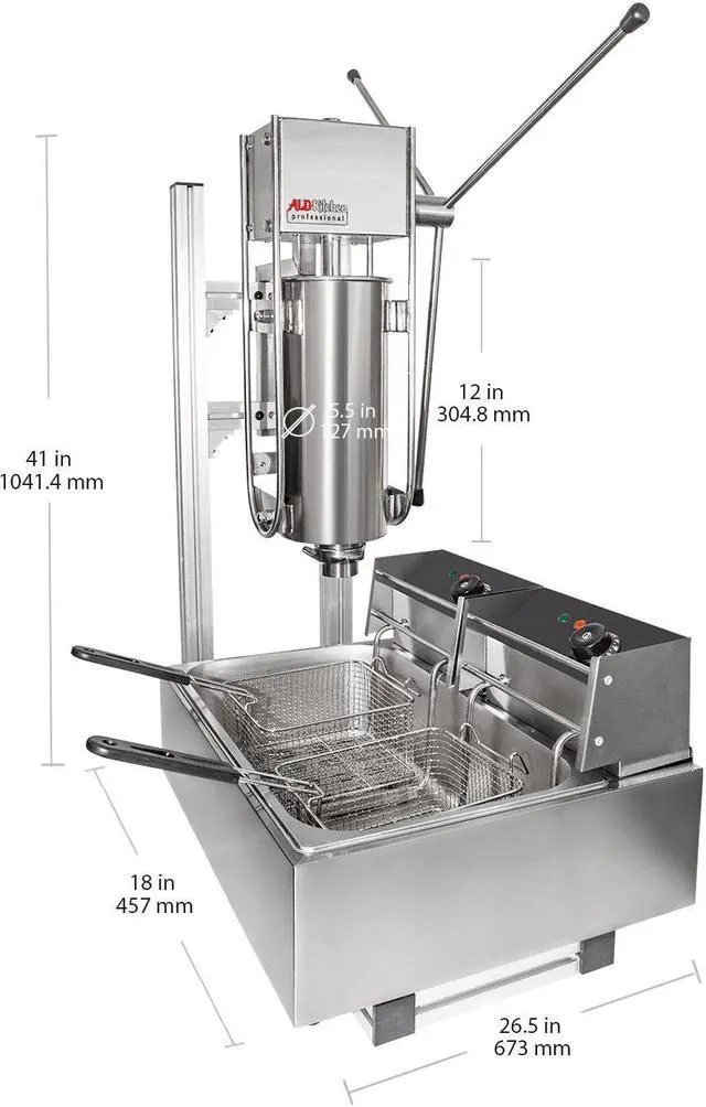 Commercial Manual Churro Maker with 5L capacity L-shape stand and double deep fryer. Various nozzles for traditional and hollow churros. The stainless steel body looks stylish and elegant.