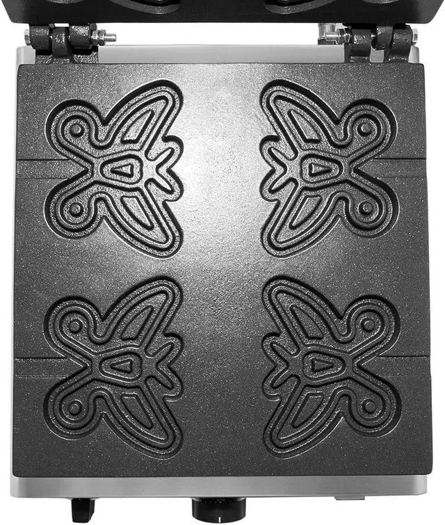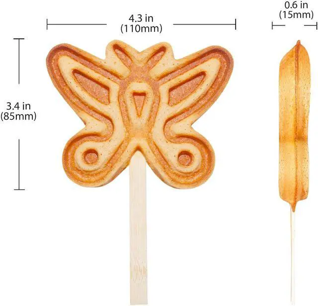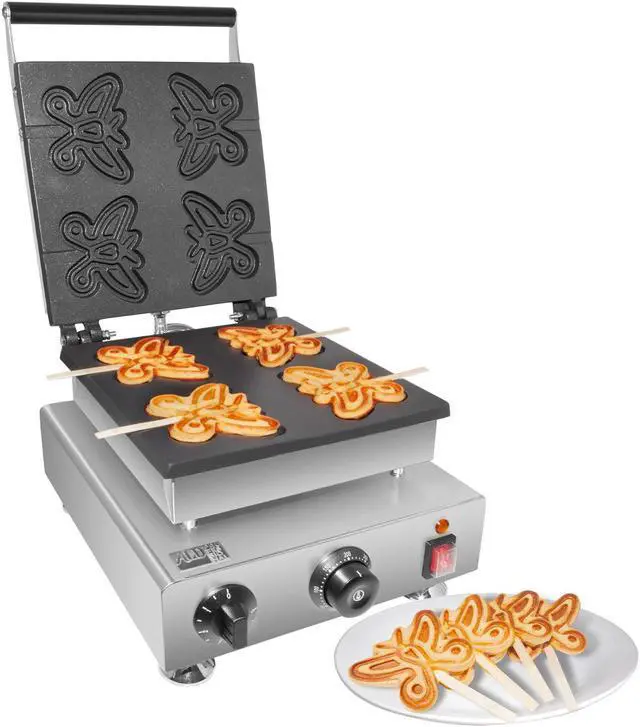 This waffle iron makes 4 butterfly-shaped waffles on a stick which can be served both indoors and outdoors. Stainless steel body and nonstick coating ensure long service life and perfect quality of the final product.