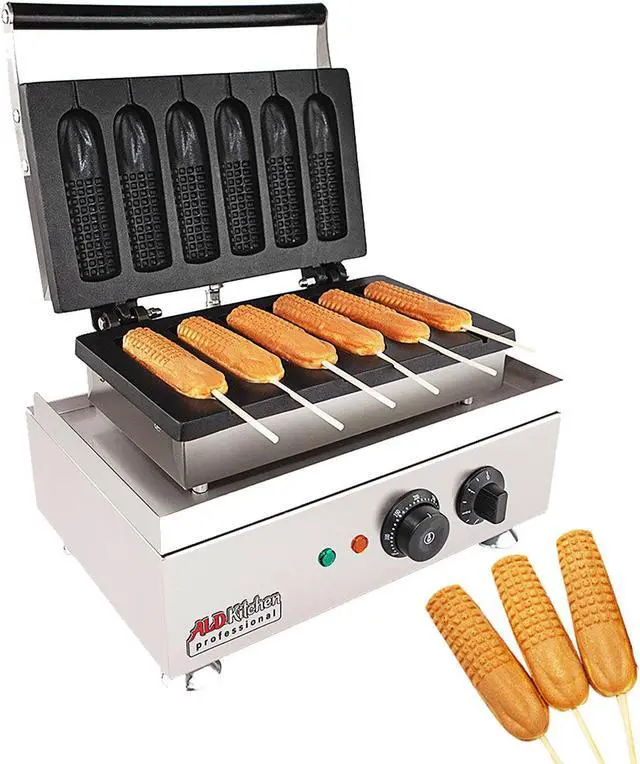 Cook six hot waffles on a stick with this commercial waffle iron! Thanks to its high-quality materials the machine is ready for extensive use in a food business. Easy to clean and enjoyable to use this waffle dog maker will become indispensable in your kitchen!