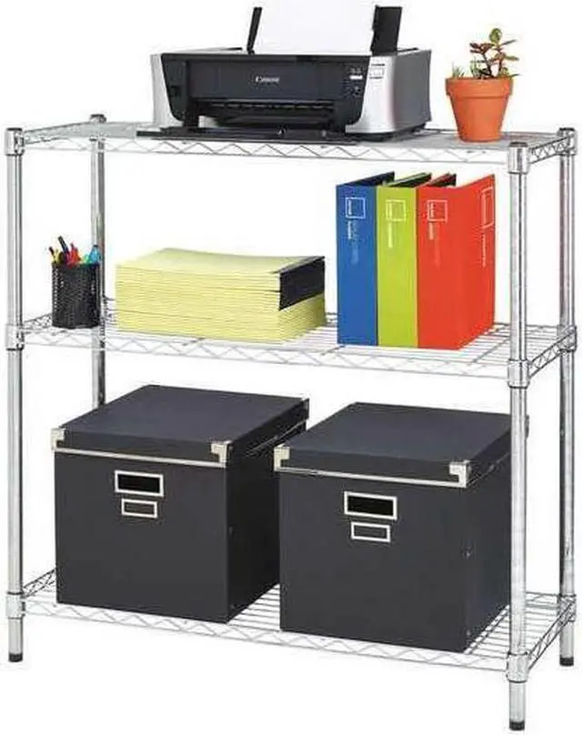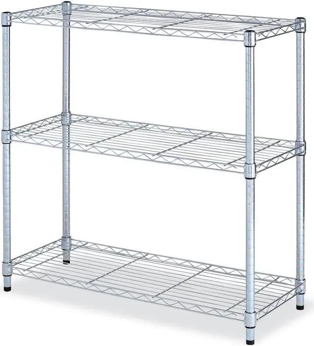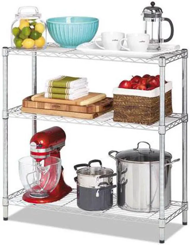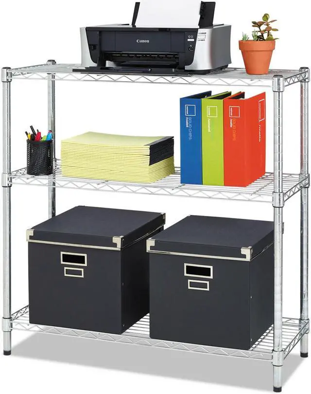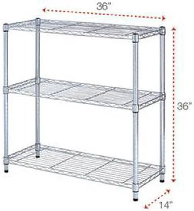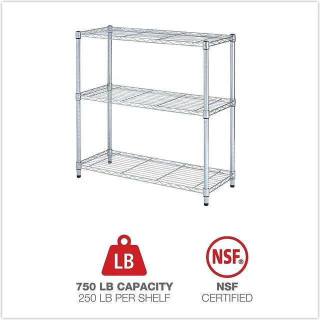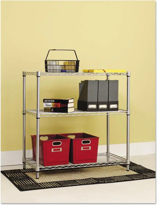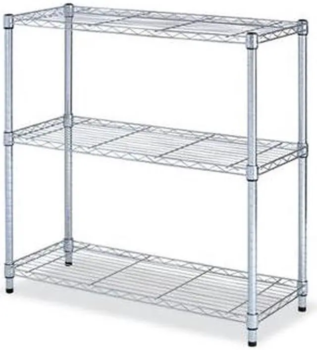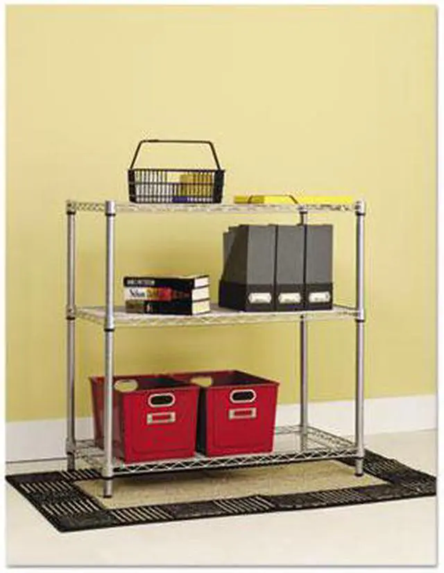 An economical storage solution for light duty storage, retail display, and residential applications. Simple, snap-together design assembles without tools in minutes. Built with a strong, welded wire construction that provides exceptional strength, durability, and stability. The open design allows air circulation and reduces dust build-up. Holds up to 250 lbs. of evenly distributed weight per shelf. Series Name: Alera Residential Wire Shelving; Number of Shelves: 3; Shelf Depth: 14"; Shelf Thickness: 1".