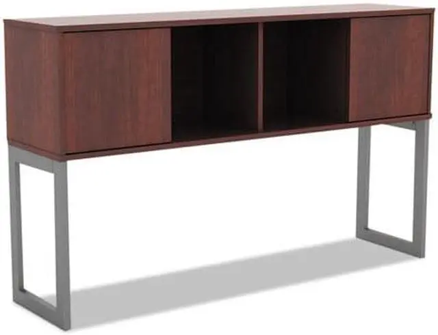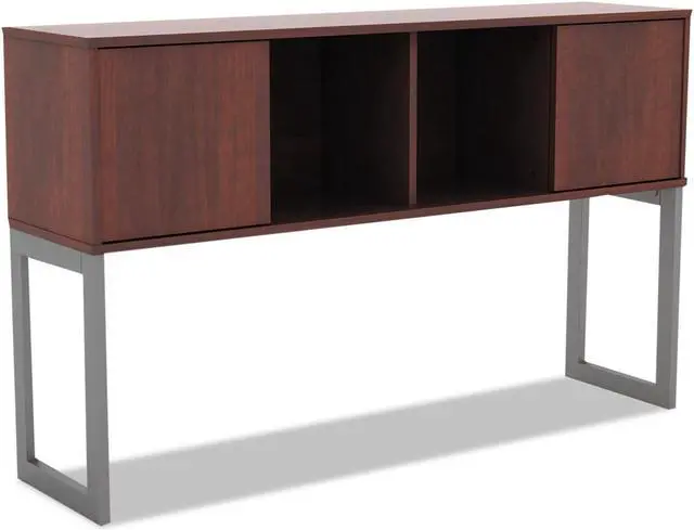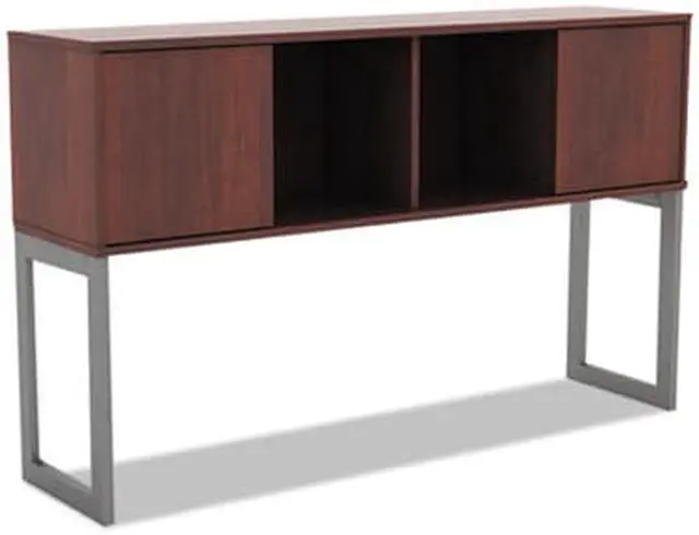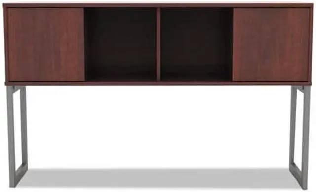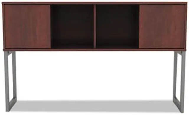 Increase productivity and deskspace with this overhead storage hutch. Sliding doors keep items easily within reach. Included doors can be omitted for even easier access. Contemporary open-plan office design. Commercial-grade woodgrain laminate is scatch-, dent-, and spill-resistant. Includes mounting tape and hardware. Color(s): Medium Cherry; Color Family: Cherry; Overall Width: 59"; Overall Depth: 15".